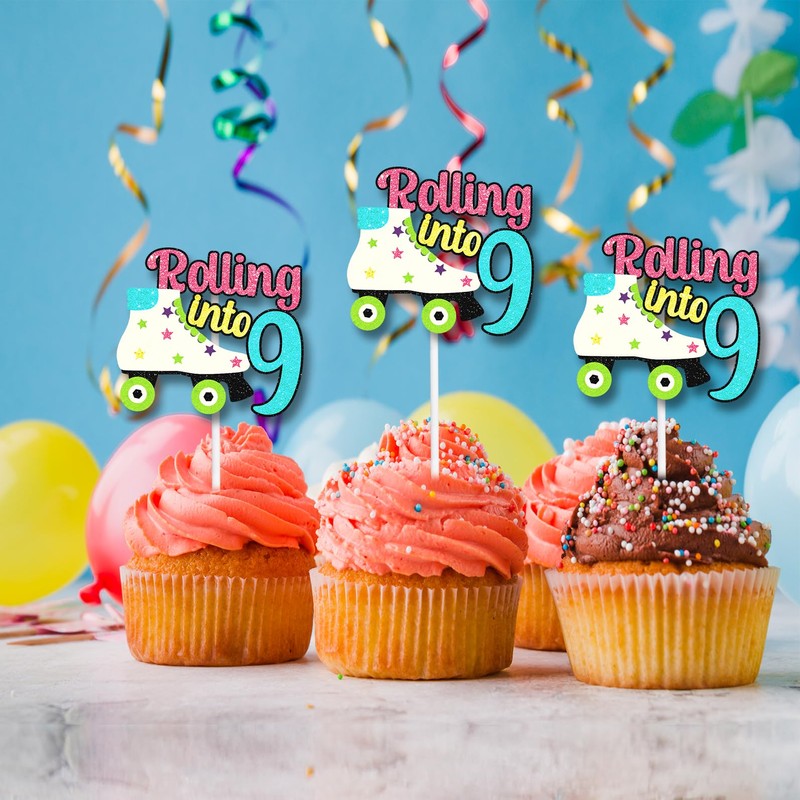 Roller Skating Cupcake Toppers Retro Theme 9th Happy Birthday 18-piece set Decorations, Roller Skating Theme Party, Birthday Party Decorations. Gifts for Kids. (9th)