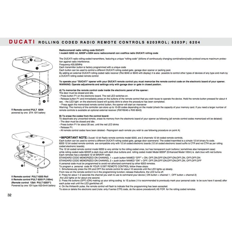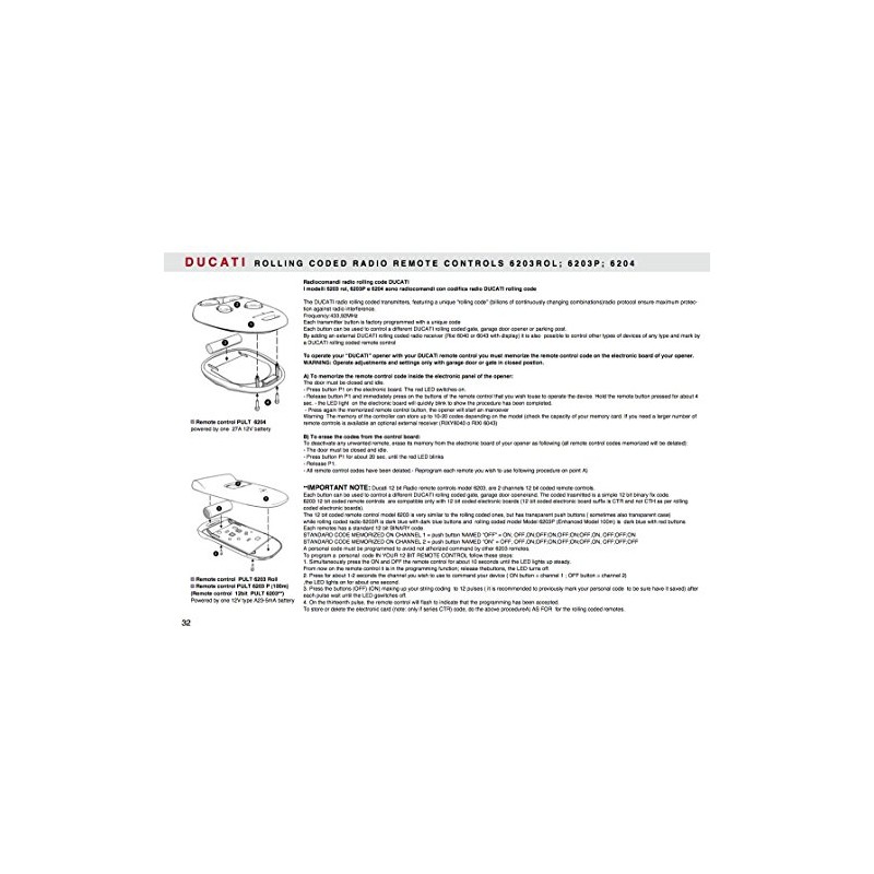 • Compatible to any DUCATI rolling coded gate or garage door openers. Warning: be sure you have a DUCATI rolling coded OPENER TO BE SURE THIS REMOTE IS COMPATIBLE TO YOUR OPENER.