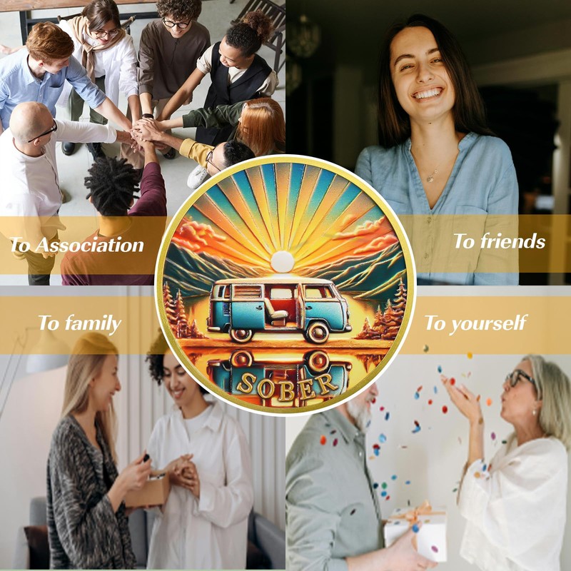 • Meaningful Design: This sobriety coin features a classic vintage camper van and a sunrise design, symbolizing rebirth from past struggles and a hopeful future. The "SOBER" lettering and mountain backdrop convey strength and hope in sobriety, making it an ideal choice for celebrating recovery milestones or as a thoughtful gift for someone on their sober journey