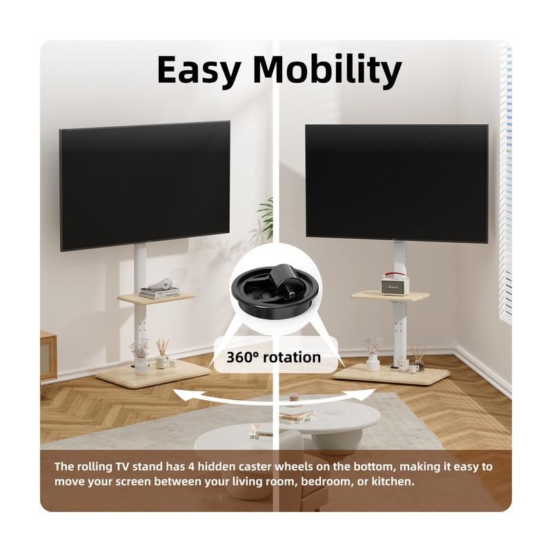 Rolling TV Stand with Hidden Wheels, Mobile TV Cart for 32-75 Inch TVs up to 99 lbs, TV Stand with Swivel and Height Adjustment, Floor TV Mount Stand with Wood Base