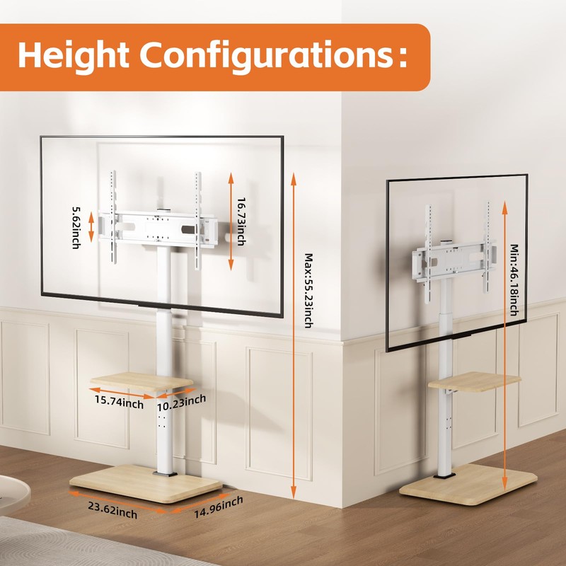 - CHOOSE THE RIGHT VIEWING HEIGHT: The floor standing TV stand is available in height configurations from 46.18 inches to 55.23 inches, with 3 levels of height-adjustable hooks and 4 levels of height-adjustable column, allowing you to place your TV at the optimal viewing level. Whether you prefer to sit or stand, this floor standing TV stand allows you to enjoy your entertainment in greater comfort. The height of the tray is adjustable, so you can position your speakers however you like.