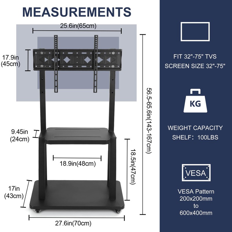 Maiproo Rolling TV Stand with Wheels for 32-75 Inch Heavy-Duty Mobile TV Cart LCD LED OLED Flat Panel Screens Smartboard Holds up to 100lbs Portable TV Stand on Wheels with Shelf Height Ajustable