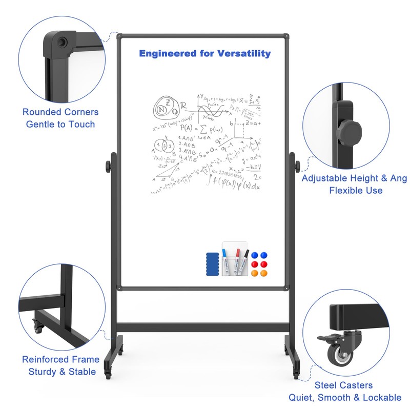- Double-Sided Magnetic Dry Erase Surface: Double your writing space with this reversible magnetic whiteboard that rotates effortlessly and locks in place. Both sides provide a smooth, durable dry erase surface—ideal for teaching, planning, presentations, or posting notes with magnets.