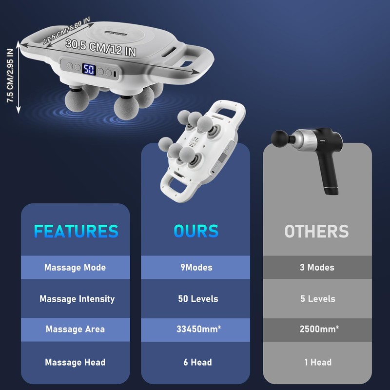 - 【6 Massage Heads & Smart Protection】: Unlike single-head massage guns on the market, our massage gun features 6 heads vibrating simultaneously at high frequency, providing wider coverage and superior massage effects. It supports hands-free, single-hand, or dual-hand operation, use it for full-body massage to meet all your muscle relaxation needs. Additionally, the built-in smart chip provides a 15-minute auto timer for intelligent protection.
