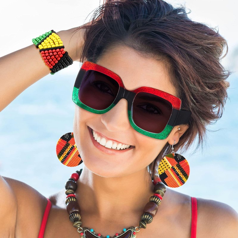 - Thoughtful and Elegant Gift: our oversized square sunglasses,jamaican bracelet and black history earrings are dainty and appealing,suitable for many occasion, such as shopping, driving, traveling, vacation, photos, beaches and parties;the african jewelry sets are ideal present for girlfriend, mother, sister, daughter and friends on Valentine's Day, New Year, birthday, anniversary, graduation and other important holidays,they will be happy to receive such beautiful gifts