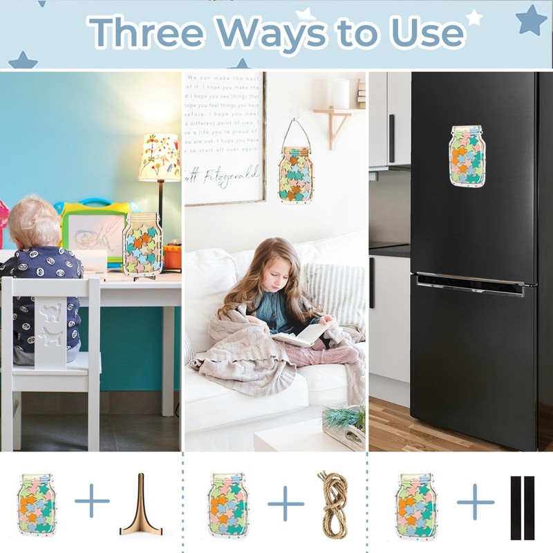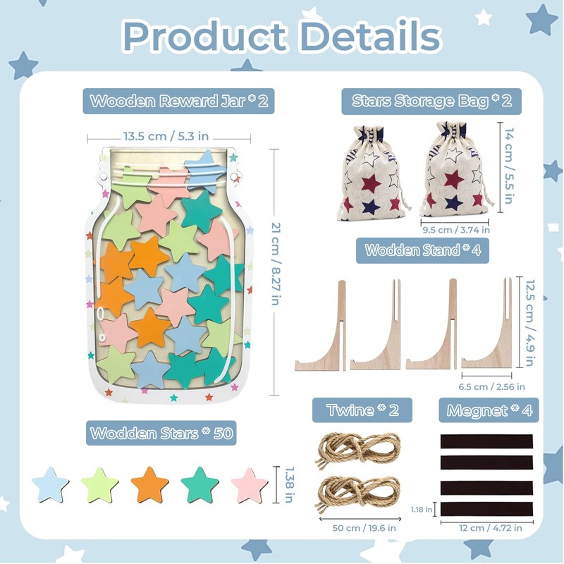 - Stars Reward Jar Set: Package includes 2 x Star Reward Jar, 50 x Colorful Stars, 2 x Star Storage Bag, 2 x Jar Stand, 2 x Rope, and 4 x Magnetic Strips. Its simple design and easy-to-use features ensure a great experience for both kids and adults