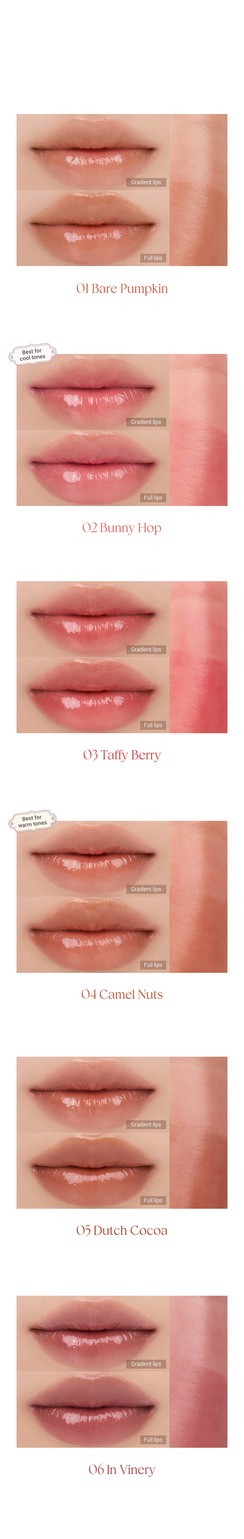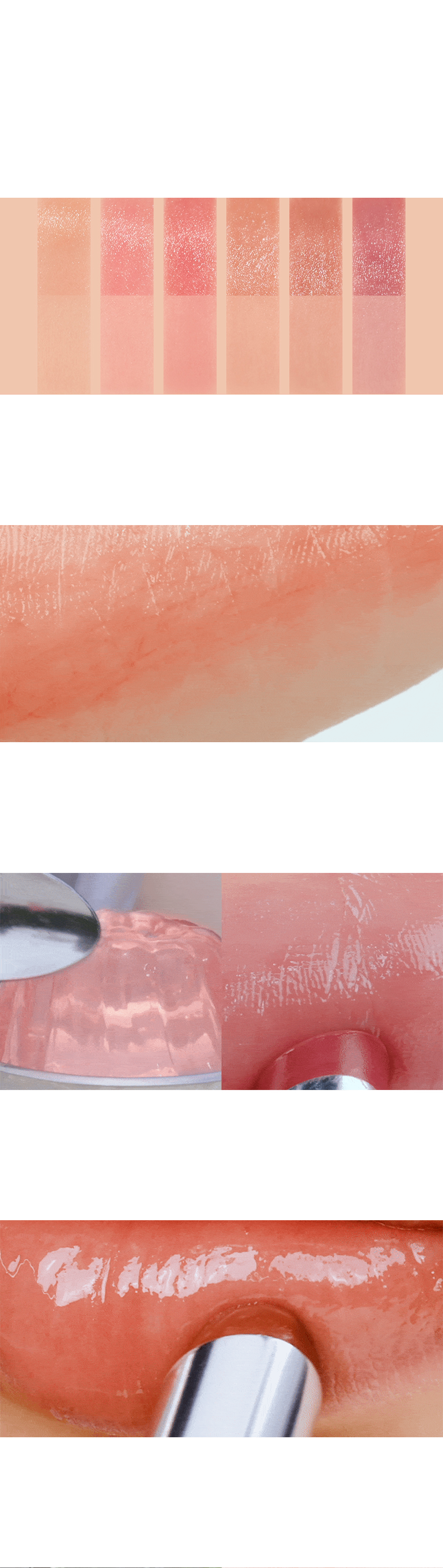 The initial color lasts for a long time with liveliness. Each shade is highly pigmented to maintain clear shade for a long time. The soft application with moisturizing effect provides clean and clear pigmentation without being stuffy like jelly. Provides subtle and sheer glow. The subtle sheer jelly lip product can be applied without extra skills. The non-sticky refreshing texture provides comfortable feeling of use without dryness.