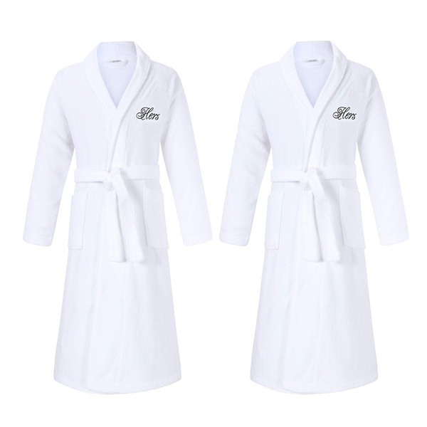 - SET OF TWO high-quality terry cotton bath spa robes with stitched HERS and HERS monograms