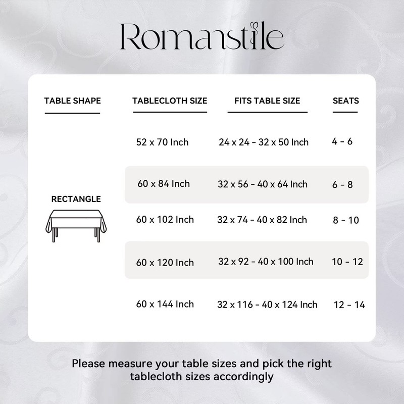 - MEASUREMENTS: Each package includes 1 piece of jacquard rectangle tablecloth measuring 60 W by 120 L inch. The tablecloth size is usually larger than your table size, please refer to the size guide before purchasing.