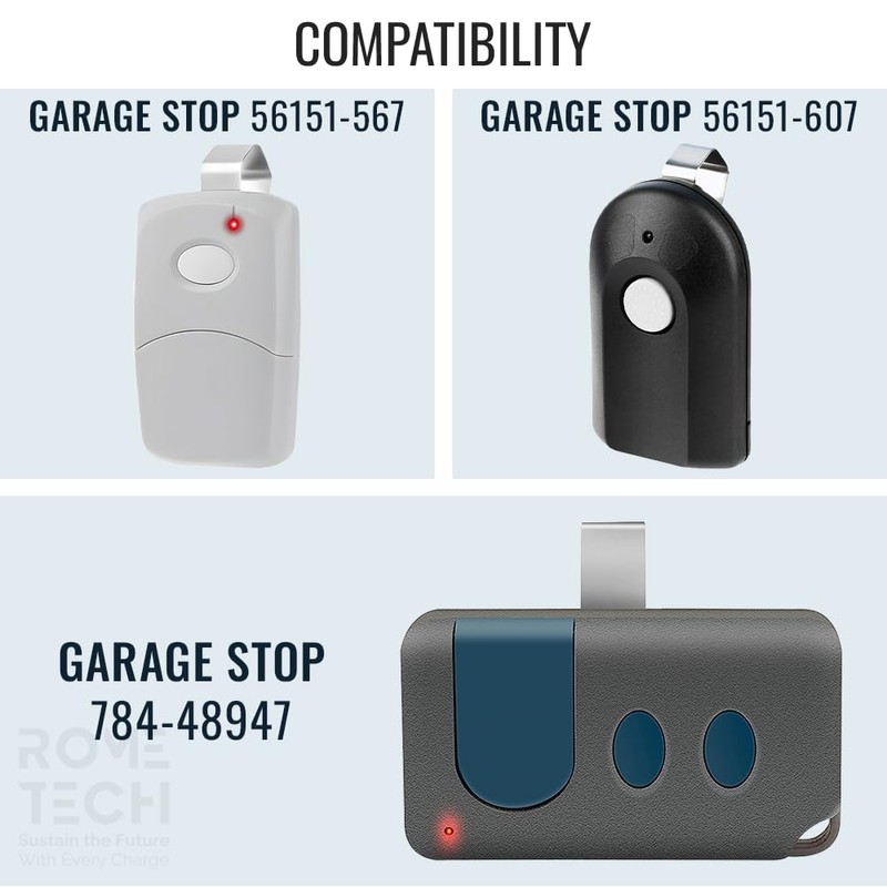 - Rome Tech CR2032 garage door opener remote battery compatible with Garage Stop 56151-567, 784-48947, 56151-607, 784-59132 Door Opener Garage Door remote. Please make sure you need battery CR2032