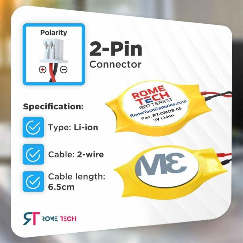 Rome Tech CMOS battery with a cable designed for reliable performance and high durability, it is guaranteed to maintain 80% of its rated capacity for 12 months from the date of installation. HP laptop CMOS battery compatible only with the original equipment