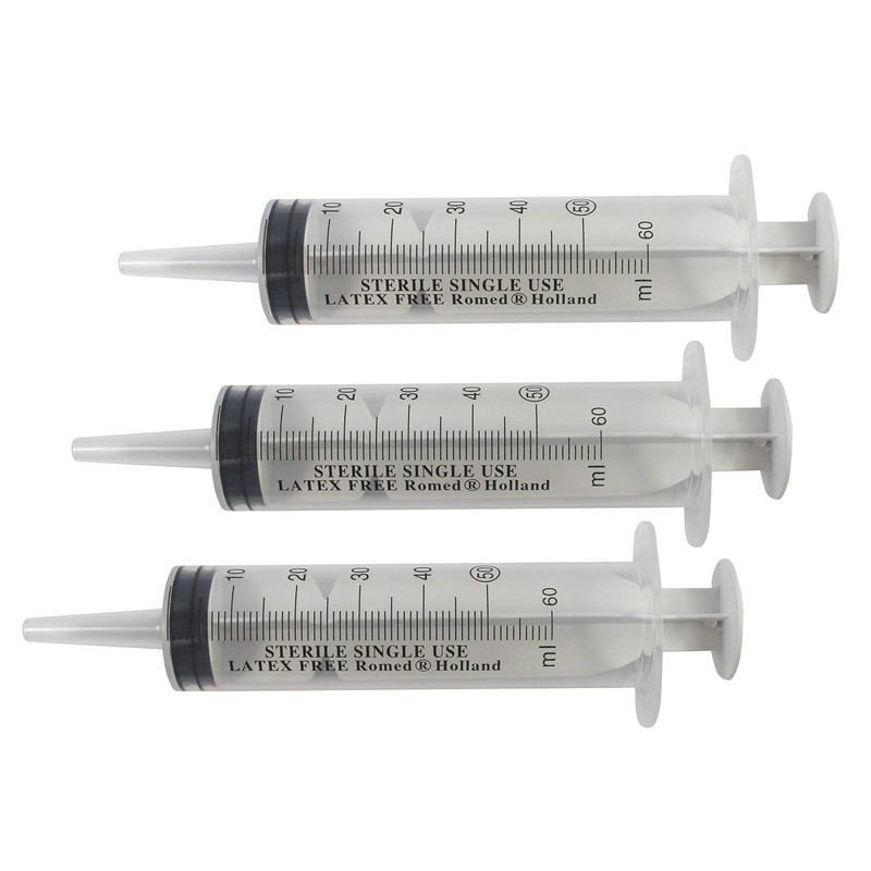 - Romed bubble syringes with 50/60 ml capacity in a practical pack of 3