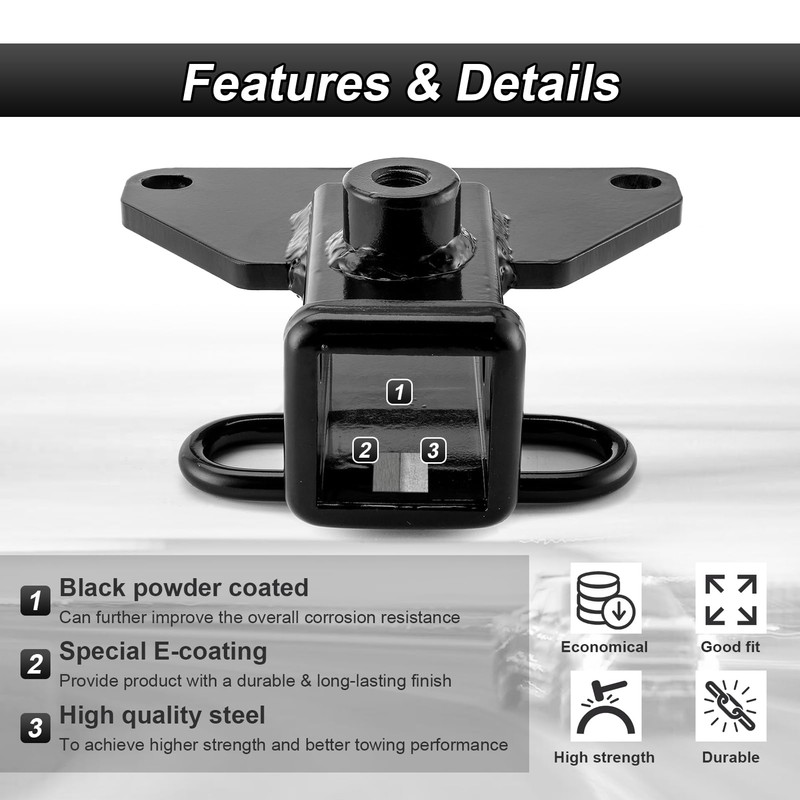 - Sturdy Construction: Made from sturdy steel with a corrosion-resistant finish, our rear receiver hitch is built to last and withstand heavy loads