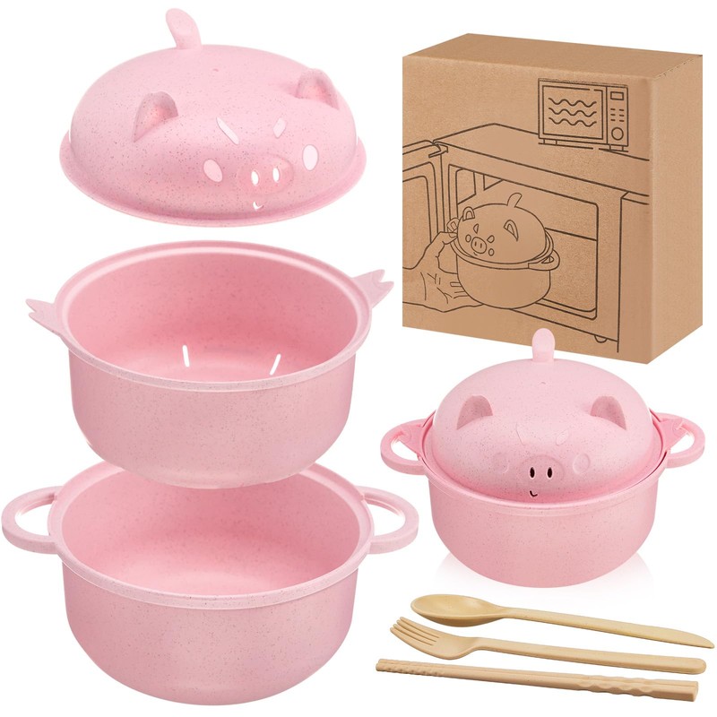 - Complete Set with Piggy: this microwave ramen cooker package includes a bottom soup bowl, a middle drain bowl, top bowl, and a set of spoon, chopsticks, and fork; With its round shape, smooth curves, and delightful piggy accents, a cute tableware for students, office workers, or anyone who loves cute and convenient dining