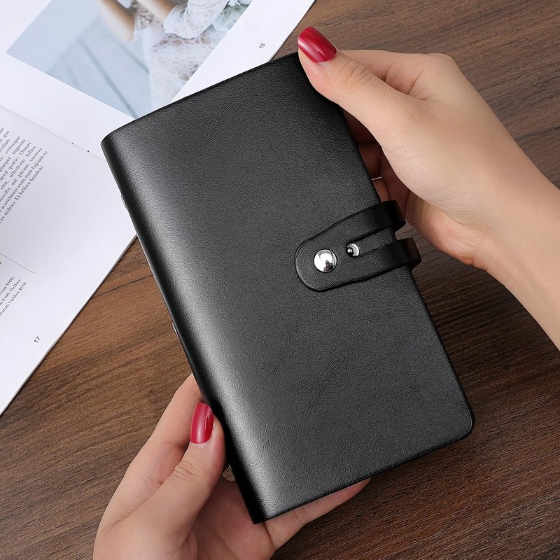 >> 1. High-quality materials: The credit card holder is made of high-quality PU leather with a smooth surface, non-absorbent sweat, non-stick dust, high waterproof, not easy to age and easy to clean. The edge of the credit card holder is reinforced to provide anti-wrinkle and anti-cracking advantages. This is the best choice for storing and managing your cards.>>2.Easy to read and manage cards: The internal card slot is made of translucent plastic. The translucent card holder page clearly shows the picture and text of the card in the card holder so you can read and manage the card. Securing all cards in a credit card holder with two rows of adjustable elastic metal buttons is the best way to prevent the loss of important credit cards.>>3.RFID Blocking: Credit card holders use RFID blocking technology to completely block electronic thieves from illegally scanning for personal information on credit cards, debit cards, and ID cards. It can effectively prevent data thieves from stealing personal information from our credit card and always protect your personal information from being leaked.Description:>>Color: Black>>Material: PU Leather>>Weight: 7.3 oz>>Size: 7.3" x 4.3" x 0.98">>Capacity: 96 standard business cards>>Uses: Effective management of business cards, credit cards, debit cards, ID cards, VIP cards, invoices, receipts, etc.What is PU leather? - It is leather made from internal cracks in leather and coated with polyurethane. - This leather is waterproof and has a high resistance to fading. - For everyday products, this leather is very good, because spills and things are easy to clean and really user-friendly.