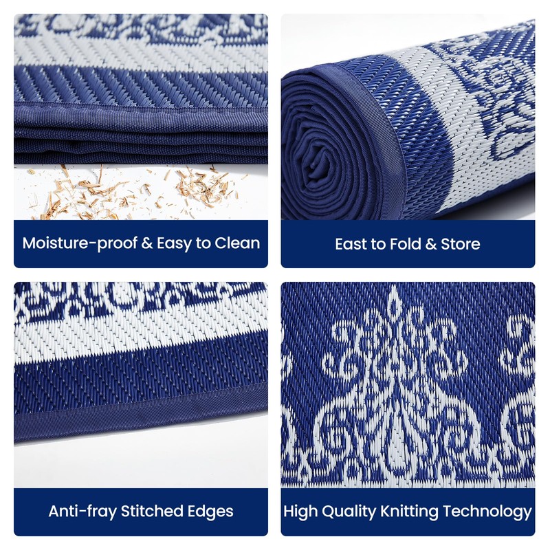 - DURABLE AND EASY TO CLEAN: Made from recycled materials, this camping mat is resistant to stains, UV damage and fading, ensuring long-lasting use. Its surface is easy to maintain and easy to clean, requiring only a few simple cleaning techniques to keep it fresh and vibrant. Designed for families and pets, this outside rug repels dust and stains, making cleaning a breeze. Additionally, its soft and comfortable texture provides a safe, comfortable space for family and pets to play and relax.