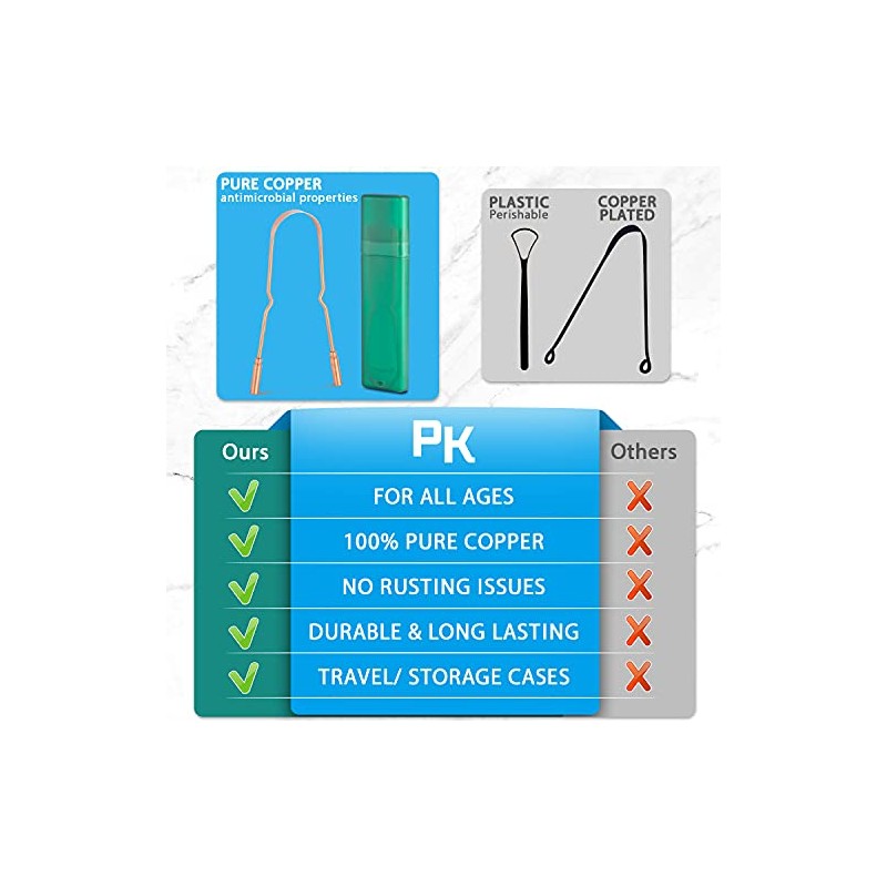 - Pure Copper Tongue Scraper: The tongue scraper is an oral care product that combines Ayurvedic ideas and techniques. Ayurveda recommends using copper dental tools to improve taste and oral health. Copper has natural cleaning properties that help make tongue scraping more effective and prevent various oral problems such as bad breath, tooth decay, and more.