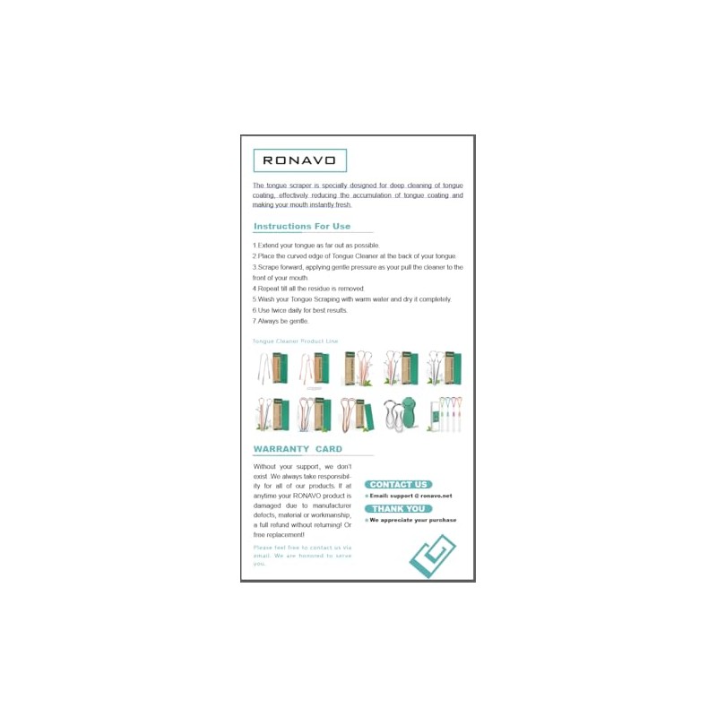 - RONAVO Customer Support The tongue scraper designed in 2 colors helps distinguish each person's tongue scraper during use and avoid confusion, which is very important for maintaining personal hygiene. If you have any problems with your new tongue scraper, we will provide free replacement service. Quality products, better service, we exist to serve you!