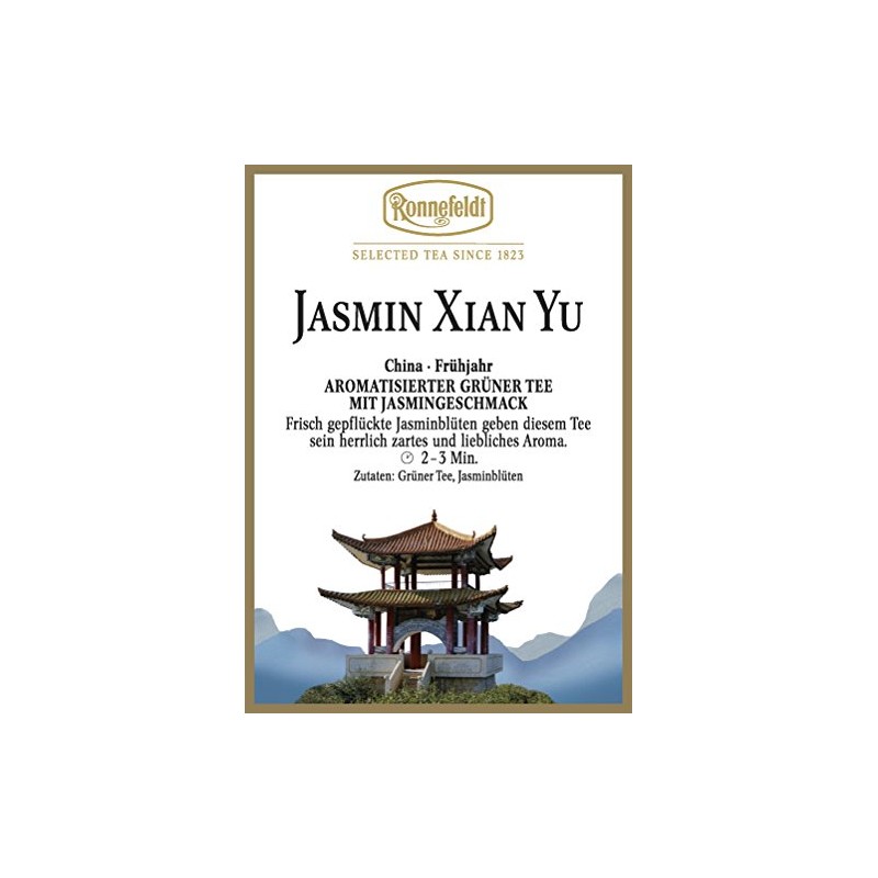- Jasmine Xian Yu by Ronnefeldt - A flavoured green tea with a brewing time of 2-3 minutes. Please always observe the recommended water temperature and brewing time - this is the only way to get a safe food.