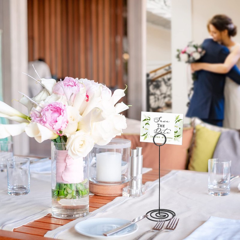 - [ 8.75 Inch Tall Table Number Holders ] - The 8.75 inch tall table card holder is easier to spot,when compare with other short/small card stand. Besides, picture holder stand with a 2.75 inch diameter spiral base can be more firmly attached to the table top. The scientific structural makes the card holder difficult to wobble. Better for showing place cards, pricing cards, food labels, memos, desktop name cards, wedding cards, baby shower and other items on various occasions.