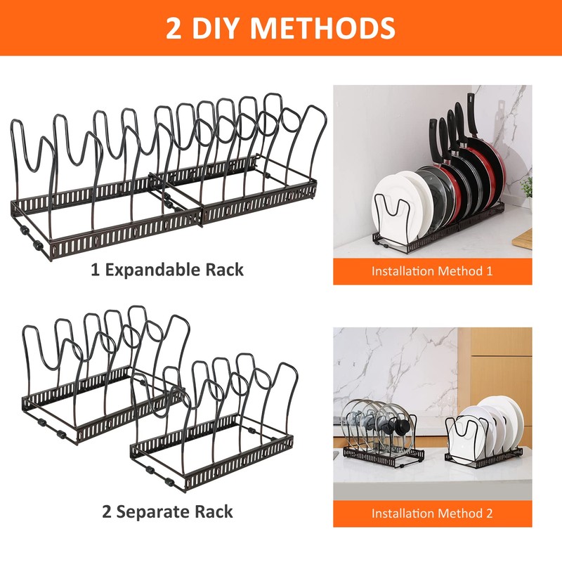 - 2 DIY Methods - This pots and pans organizer under cabinet has 2 DIY methods. It is fully adjustable between 11.8 inch to 22.8 inch in length. It can also be used as a separate two-piece cookware organizer or combined one-piece frying pan organizer, both allowing for the same levels of secure and convenient storage. The baking pan organizer with two installation methods can meet all your storage needs.Tips:The maximum size of product installation is: 22.8*7*7in.