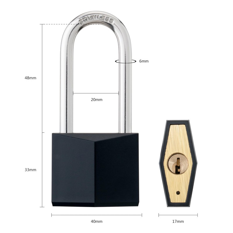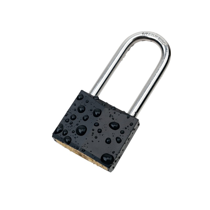 - Keyed padlock features a durable solid brass body and a stainless steel 304 long shackle to resist corrosion.