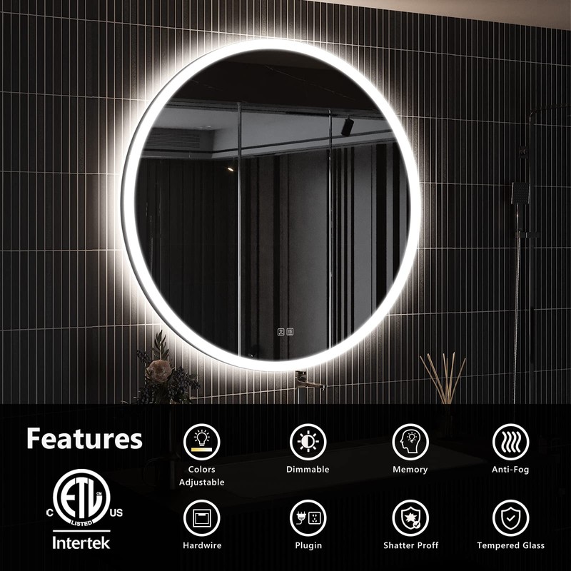 - 【ETL Certification & High Quality Materials】 This product is ETL certified, conforming to U.S. producing safety standard. This bathroom LED vanity round mirror adopts environmental friendly, copper free HQ silver coating glass, and IP54 waterproof LED lights to ensure 100% safety in wet bathroom.