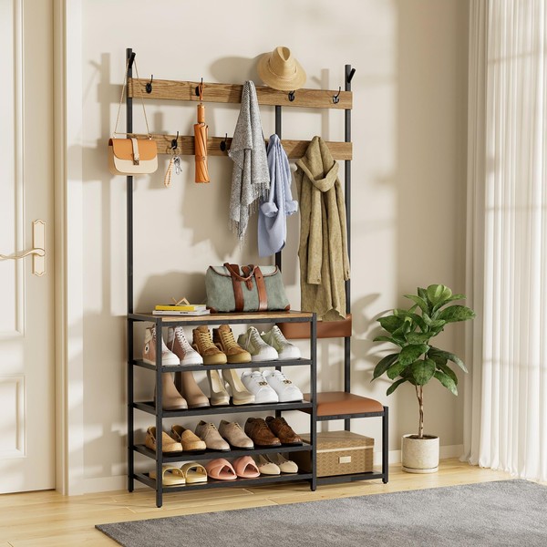 - 【4-in-1 Hall Tree】Enhance your entryway with our versatile hall tree. Equipped with a hanging rod, shoe bench, shoe rack, and coat hooks, it offers convenient storage for coats, shoes, and essentials, plus a comfortable seat for changing shoes. Perfect for organizing and streamlining your space, this all-in-one solution is essential for any home.