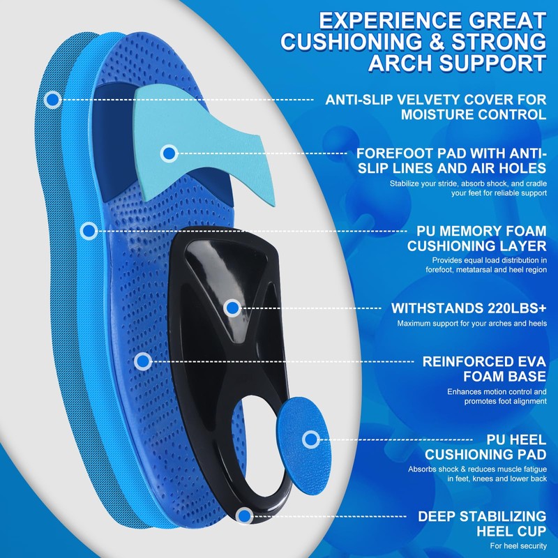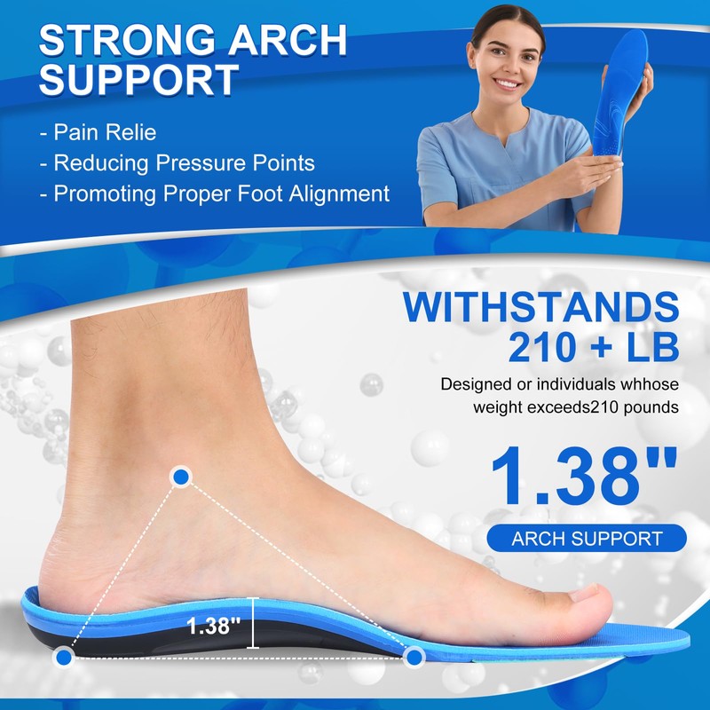 - COMFORT INSOLES FOR ALL-DAY STANDING - Our arch support insoles can maintain stability, support, and relieve foot pain whether you are walking, standing for a long time, running, training. These versatile orthotic insoles can be used in most sneakers, running shoes, walking boots, work boots, high-capacity formal shoes and hiking shoes. Additionally, the orthopedic insoles' high arch support promotes an upright heel posture, reducing the risk of ankle injuries.