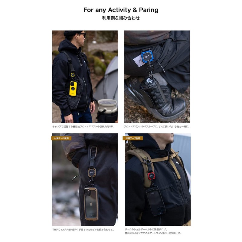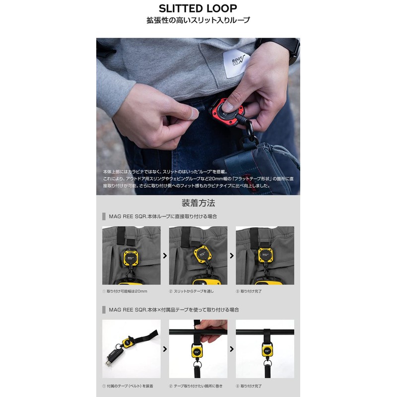 - (Highly Expandable Slit Loop) The upper part of the main unit is equipped with a slit loop rather than a carabiner. This allows you to attach directly to any 20mm wide "flat tape shape" area such as outdoor sling or webbing loop. In addition, the fit on the mounting side has been improved compared to the carabiner type. If you attach the included nylon webbing, you can also connect it to a carabiner or horizontal molle tape, so you can arrange it according to your needs