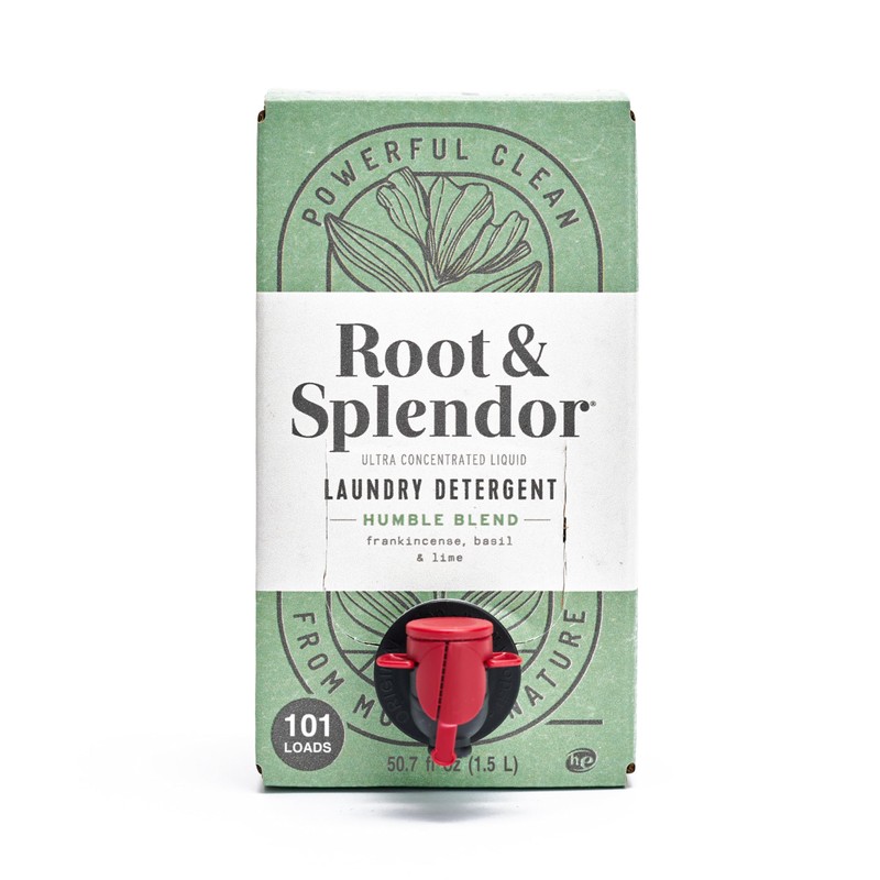 Root and Splendor eco friendly laundry detergent uses nature’s most powerful bioactive ingredients for a safe + effective clean. The powerfully effective, all natural ingredients provide a premium, enzymatic deep clean, cleaning beneath the surface fibers and removing all stains and odors.The beautiful scent profiles are composed of only pure and natural essential oils. Transparent about all ingredients, our clean detergent formula is housed in sustainable bag-in-box packaging which provides an 800% reduction in pollution compared to the rigid plastic jug of other laundry detergents when looking at the full life cycle of the package.No dilution necessary, simply dispense 1 Tablespoon of our ultra concentrated formula per load of regular laundry (or 2 Tablespoons for large or heavily soiled loads). For extra stain fighting power, we make a premium Stain Remover.Effective in hot and cold water and all machine type safe, including HE, top and front load machines, the natural laundry soap is also sewer, septic and grey water system safe.Our cruelty free laundry detergent contains no fillers, synthetic fragrances, dyes, additives or any other harmful ingredients.Root and Splendor is proudly woman owned and made in the USA. The company was founded by a mom of 4 boys who wanted both safe and effective all natural detergent to clean the mountains of dirty laundry her family produced. We are honored to share it with you to help nurture your thriving home. Enjoy your new and improved laundry experience! Choose from any one of our 5 scents: Free and Clear - unscented for sensitive skin and babies (no essential oils) Hush Blend - lavender, rosemary, sandalwood Swell Blend - lemongrass, bergamot, cedarwood Humble Blend - frankincense, basil, lime 2250 Blend - patchouli, lemongrass, lavender, basil