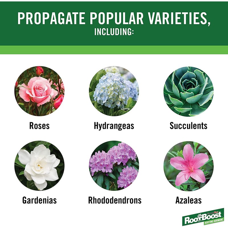 Pack of 8: RootBoost, 2 OZ, Rooting Hormone, In powder form. Faster, Healthier Rooting For Any Plant Cutting, Blend Of Nutrients, Specifically Designed To Enhance The Propagation Of Plant Cuttings, Easy To Use, Common Plants To Root Include Azalea, Barberry Begonia, Crysanthmum, Crape Myrtle, Euonymus, Forsythia, Fuchsia, Geranium, Holly, Ivy, Juniper, Lilac, Pachysandra, Privet, Pyracantha, Rhododendron, Rose, Spiraea, Taxus Yew & Viburnum, Bottle.