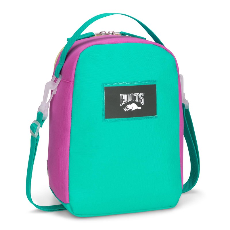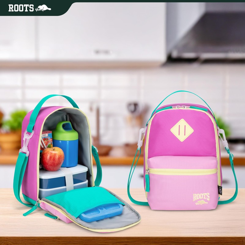 Roots Insulated Lunch Bag – Made from Recycled Polyester, with Exterior ID Label, Adjustable Shoulder Strap & 2 Zippered Compartments – 7L, Pink & Turquoise