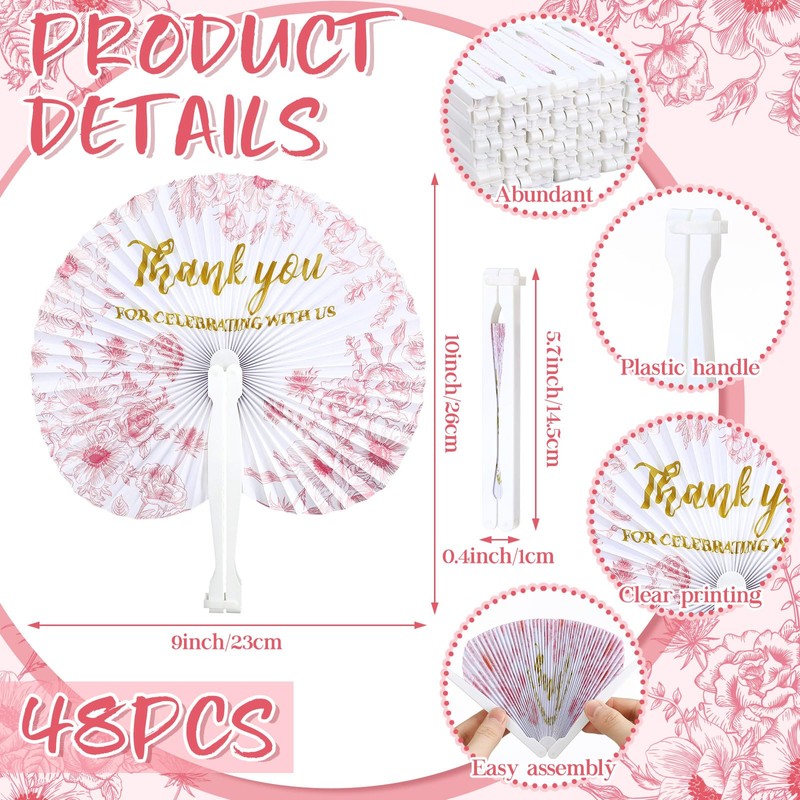 - Comfort and Convenience: pack of 48 wedding hand fans, measuring about 5.71 x 0.79 inches when folded and 9.06 x 10.24 inches when unfolded, these fans are compact, easy to carry and store; This package of 48 fans ensures plenty for your guests at any social event