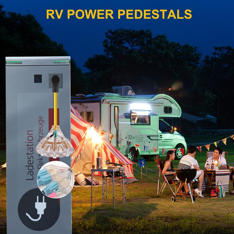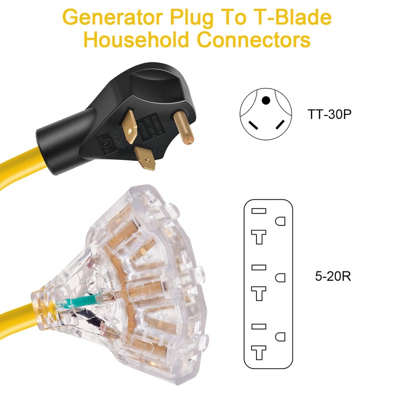 • 【Produc Specification】: Support max 30 Amp overload, 125V, max wattage 3750 watts, 1.5 feet,STW power cord with TT-30P male plug and 3 X 5-15/20R female receptacle.
