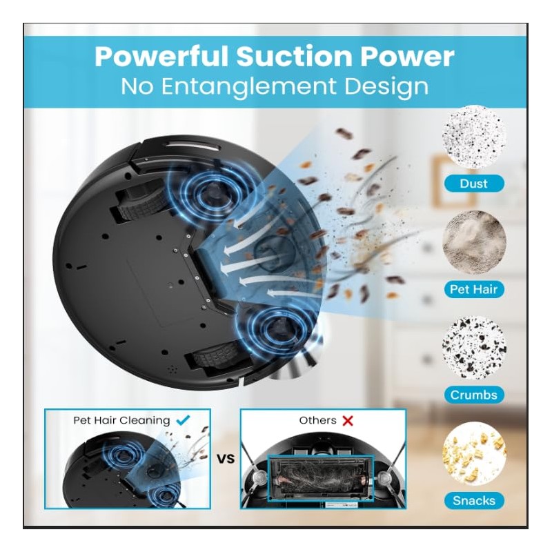 - 3000Pa Cyclone Cleaning SystemROPVACNIC robot vacuum, fortified with enhanced, hard-hitting suction power, increases the cleaning efficiency by 30%. It proficiently vacuums all dust, pet hair, crumbs, and various debris on multiple surfaces such as hardwood floors, low-pile carpets, etc.