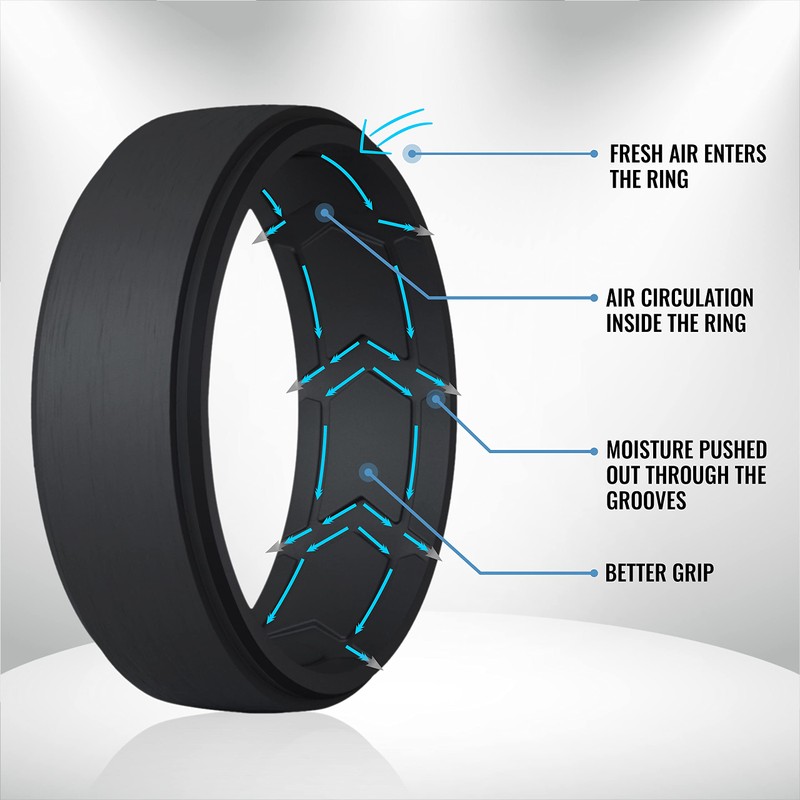 - HIGH QUALITY MATERIAL & DESIGN: ROQ's silicone wedding rings/bands are made from 100% medical grade silicone that is durable, breathable and extremely comfortable you won't feel it on your finger. Ergonomically designed, the modular arrow shape allows airflow from outside circulating and pushes moisture out through the grooves. These silicone bands are ideal replacements for traditional wedding rings to keep it safe from being scratched or damaged.