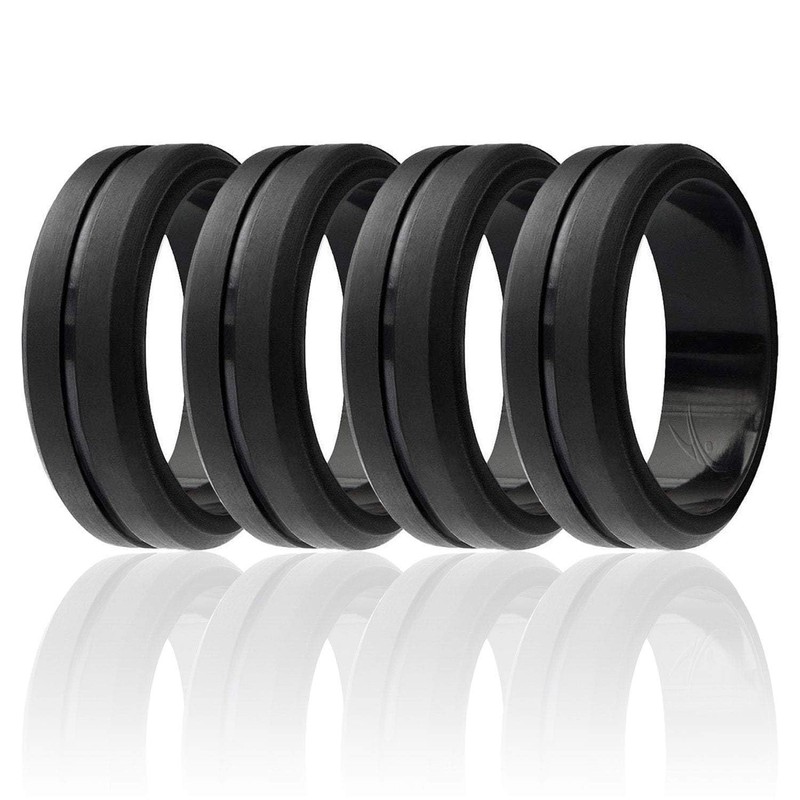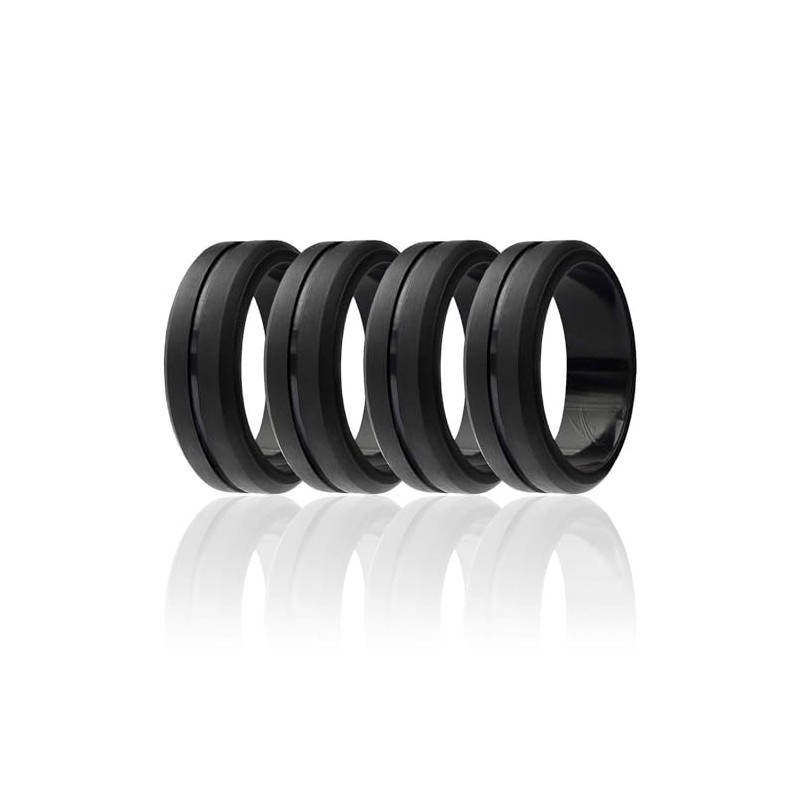 ROQ Silicone Rubber Wedding Ring for Men, Comfort Fit, Men's Wedding Band, Breathable Rubber Engagement Band, 8mm Wide 2mm Thick, Engraved Middle Line, 4 Pack, Black, Size 10