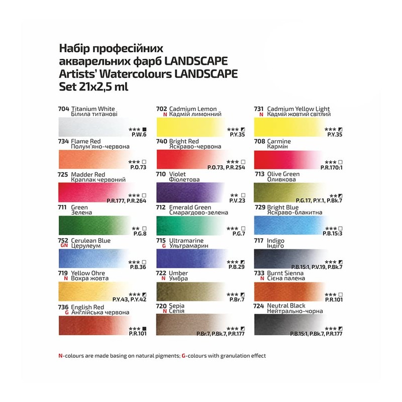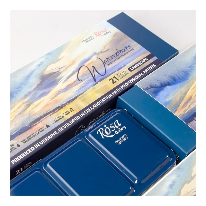 LANDSCAPE set of 21 colours in indigo colour case is designed for artists who are able to capture the mood, and atmosphere of the place and display them onto paper. Most of the colours in the set are monopigmented, which allows you to create pure shades when mixed. The maximum level of lightfastness of practically all colours of a set s the preservation of artworks over time. The design of the set is based on a painting by the famous Ukrainian watercolour artist Ihor Yurchenko. The painting is done with Rosa Gallery watercolours.