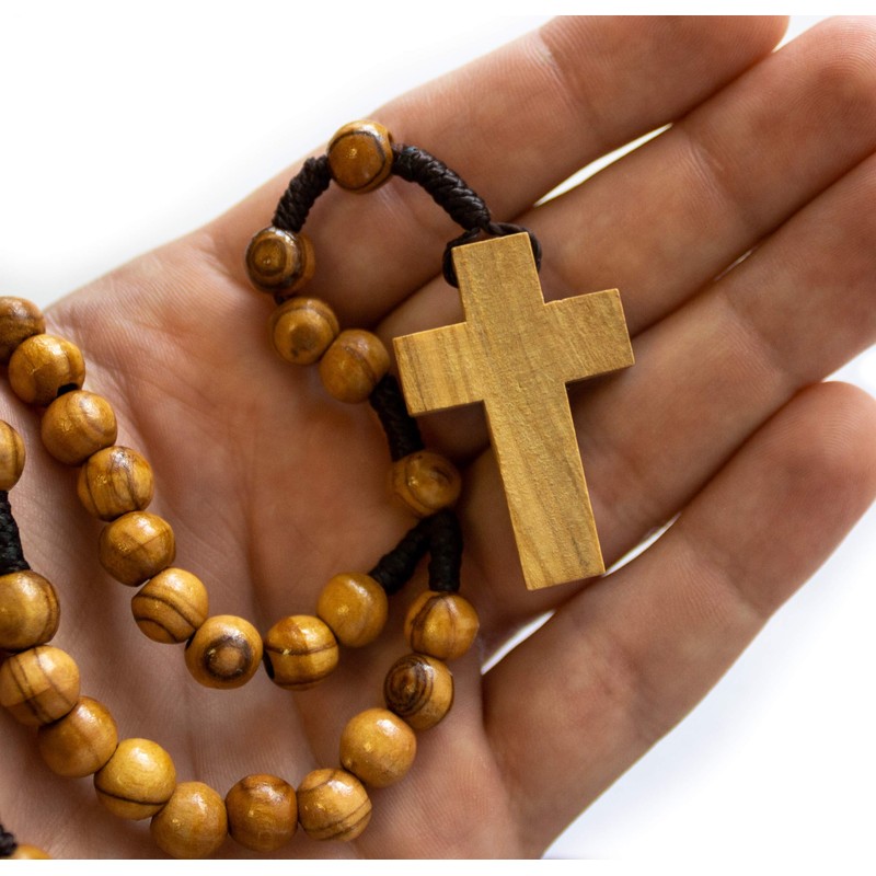 - SOLID OLIVE WOOD ROSARY BEADS, MADE IN ISRAEL: The included 15-inch rosary comes with solid wood, 8-millimeter beads and a dangling wooden cross pendant all crafted from genuine olive wood from the Holy Land of Bethlehem. The beads are natural and smooth and are threaded on a traditional, rope cord.
