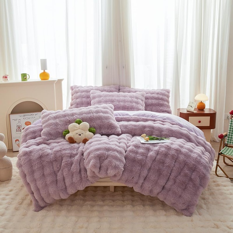 Roscloud Rabbit Plush Kids Girls Purple Comforter Sets Queen - 3PC Faux Fur Bed Set Skin Friendly Soft Warm Velvet Flannel Fluffy Fuzzy Bedding(Comforter x 1 Pillowcases x 2)