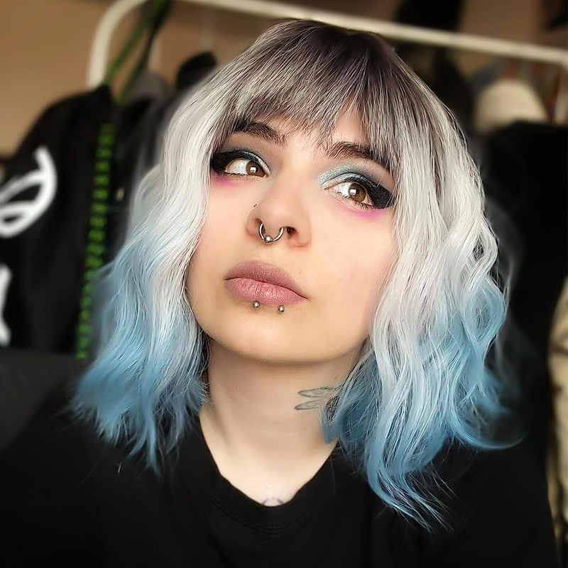 Rose bud Wavy Bob Wig with Bangs Synthetic Natural Wig Short Curly Wigs for Women Thick Ombre Silver to Blue