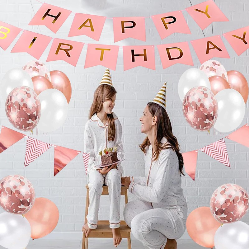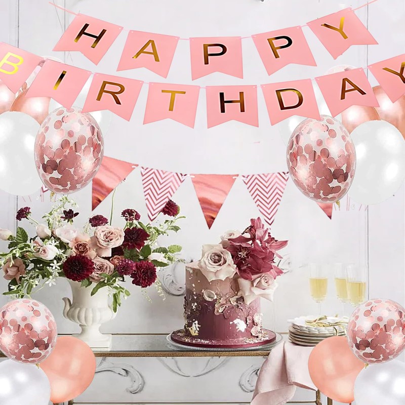 Rose Gold Birthday Decoration, 17 pcs Birthday Party Supplies Including Happy Birthday Banners Triangle Flag Bunting Confetti Ballons Latex Balloons