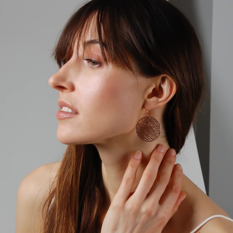 - STYLISH DESIGN - These lightweight, trendy gold dangling earrings feature a shimmering round dangle with filigree details. In a high-shine finish, these rose gold dangling earrings for women are a simple yet elegant everyday fashion statement.
