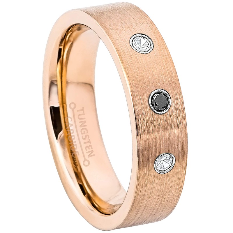 - High quality one of a kind custom-made Tungsten Carbide Wedding Band with Natural Genuine Round Cut SOLITAIRE or 3-STONE Black Diamond Gemstone. 6mm Brushed Finish Rose Gold Ion-Plated Pipe Cut Tungsten Wedding Band. Unisex Tungsten Carbide Ring, Engagement Ring, Anniversary Ring.