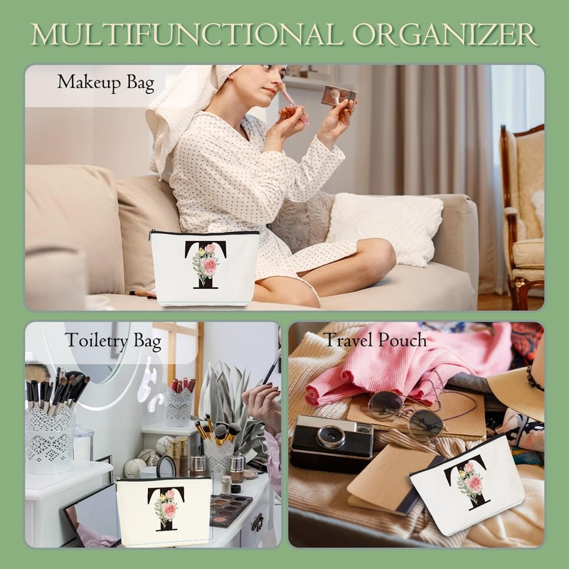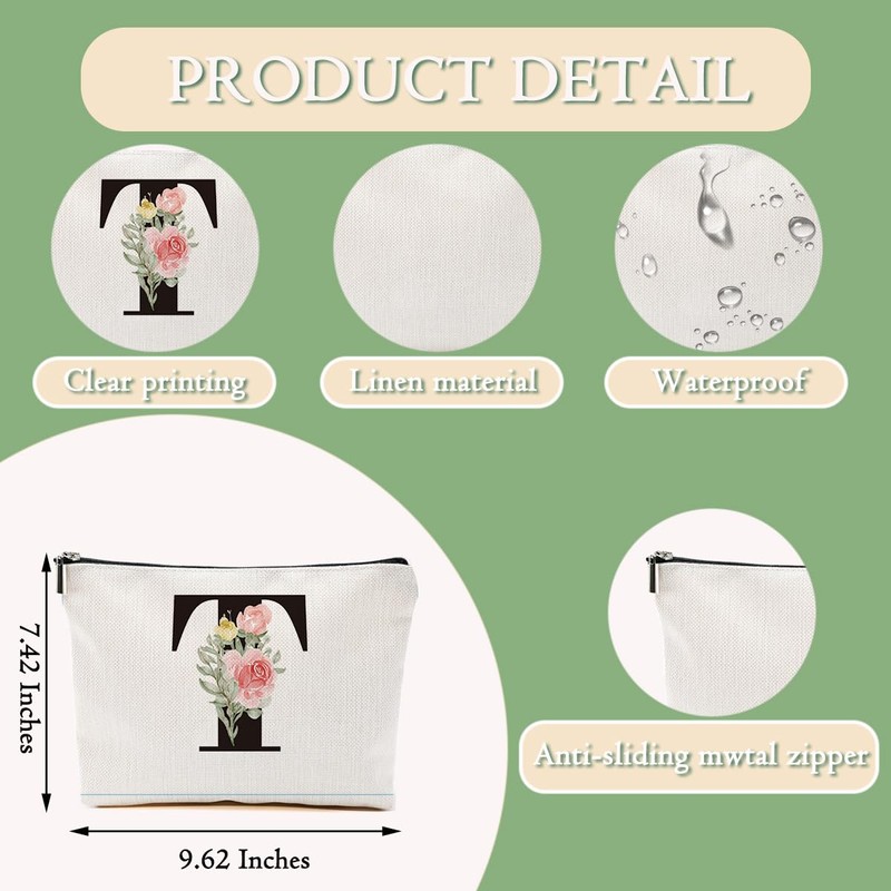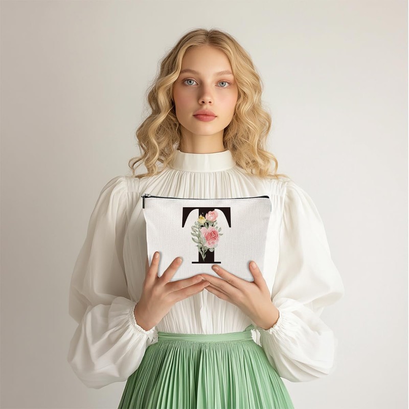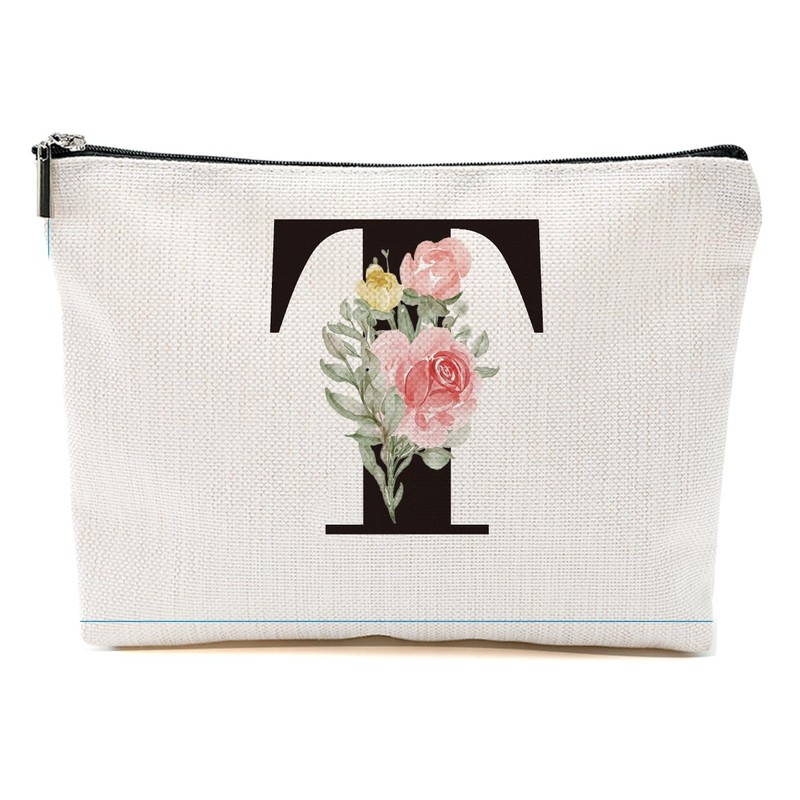 Rose Letter Initial T Makeup Bags for Women Lined Monogram Cosmetic Bag with Zipper Birthday Gifts for Women Girls Bridesmaid Best Friends Sisters, Travel Toiletry Bag, Wedding Gifts