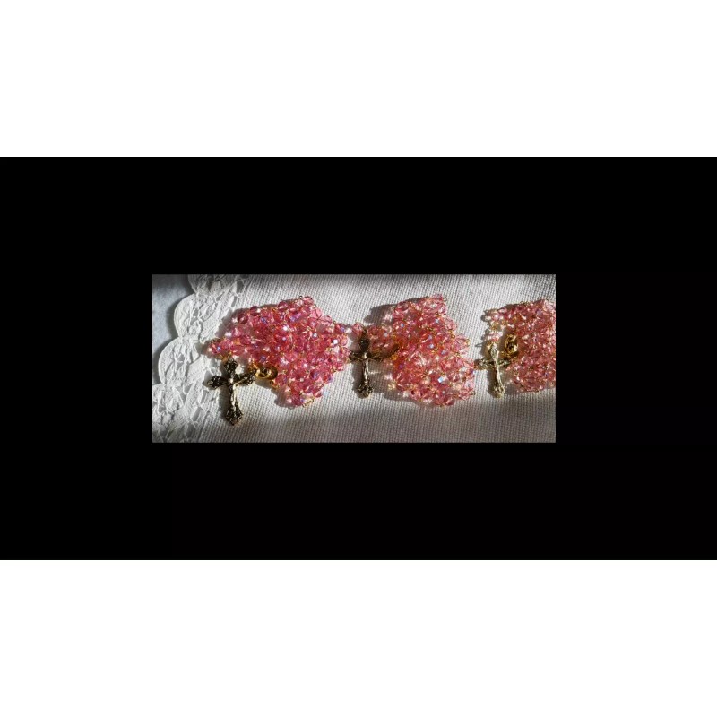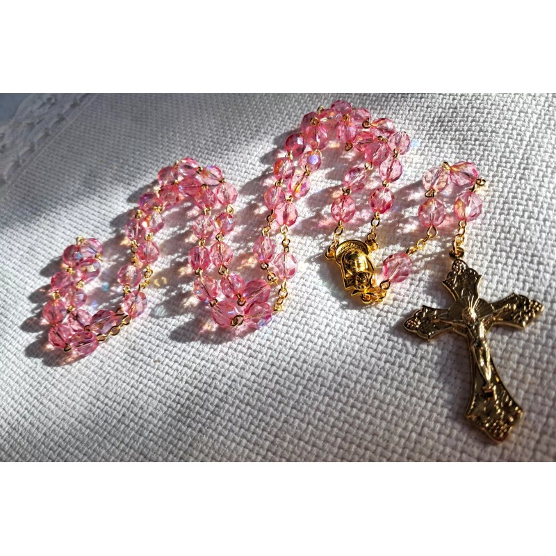 Offering one lovely new crystal bead rosary made in the Czech Republic. Faceted round Czech glass beads measure 8mm. The bead color is light pink ab. Entire rosary is finished in gold. Italian made & designed crucifix measures 2" long x 1-1/4" wide. Rosary measures 21.5" long. We carry the same rosary in a darker shade in the same size and a smaller 6mm bead size in the same color.