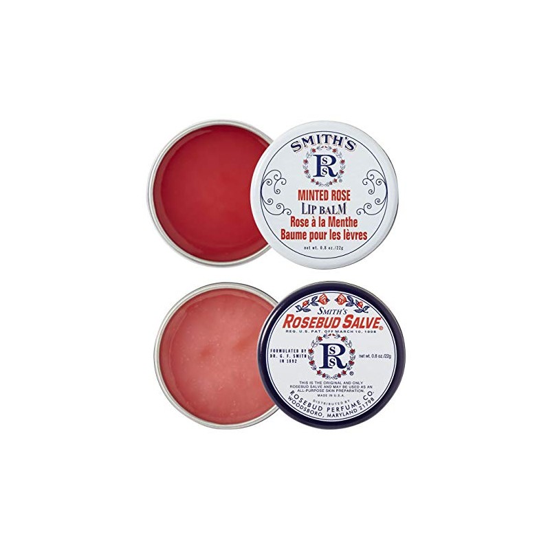 Experience the healing benefits of Smith's Rosebud Salve. Each purchase includes a full size tin (0.8oz ) of both the original Rosebud Salve and the Minted Rose Lip Balm. Both products are excellent skin moisturizers, chaffed skin healers and lip balm. Original Salve: A miracle in a can! Our world famous Rosebud Salve has been a family favorite since 1892. Celebrities love the consistency and emollient texture of this #1 selling lip balm and all purpose salve. Minted Rose Lip Balm:The cool "Zing" of peppermint! Smith's Minted Rose Lip Balm Tin by Rosebud Perfume is known for its moisture, gloss, and fresh peppermint taste. It is a blend of "Trade Secret" essential oils and pure peppermint oil. Many customers use it for massage. Dab a bit on you temples to help relieve headaches and tension. Size: 2 x 0.8oz tins