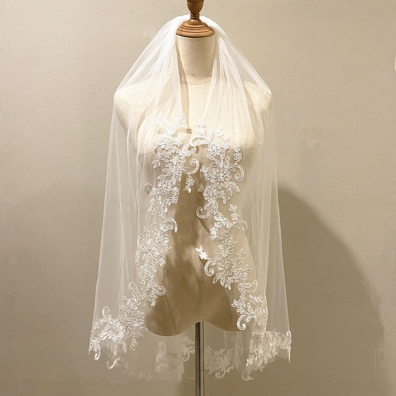 Roseeden One Tier 1 T Velo de encaje para novia, velo corto de tul suave con peine de metal, Marfil con encaje, One Tier Length 35", Width 57"