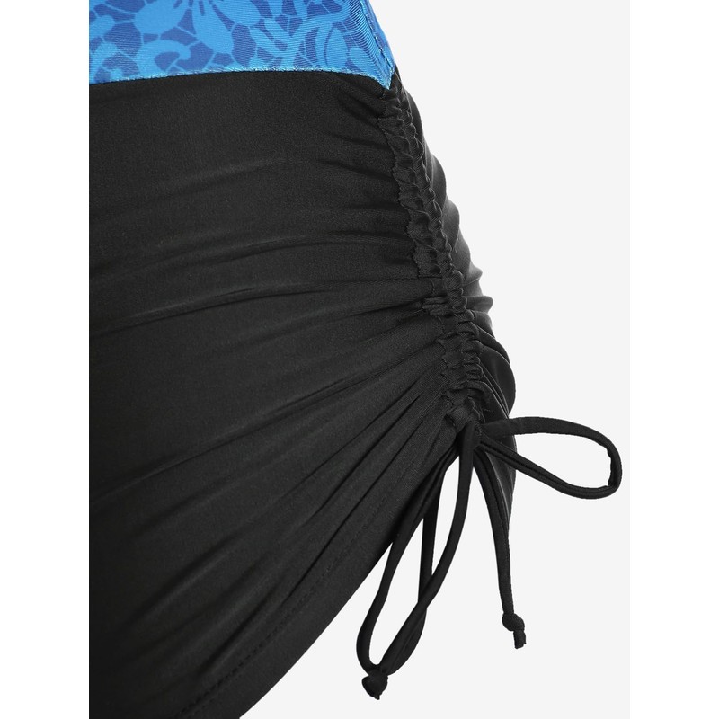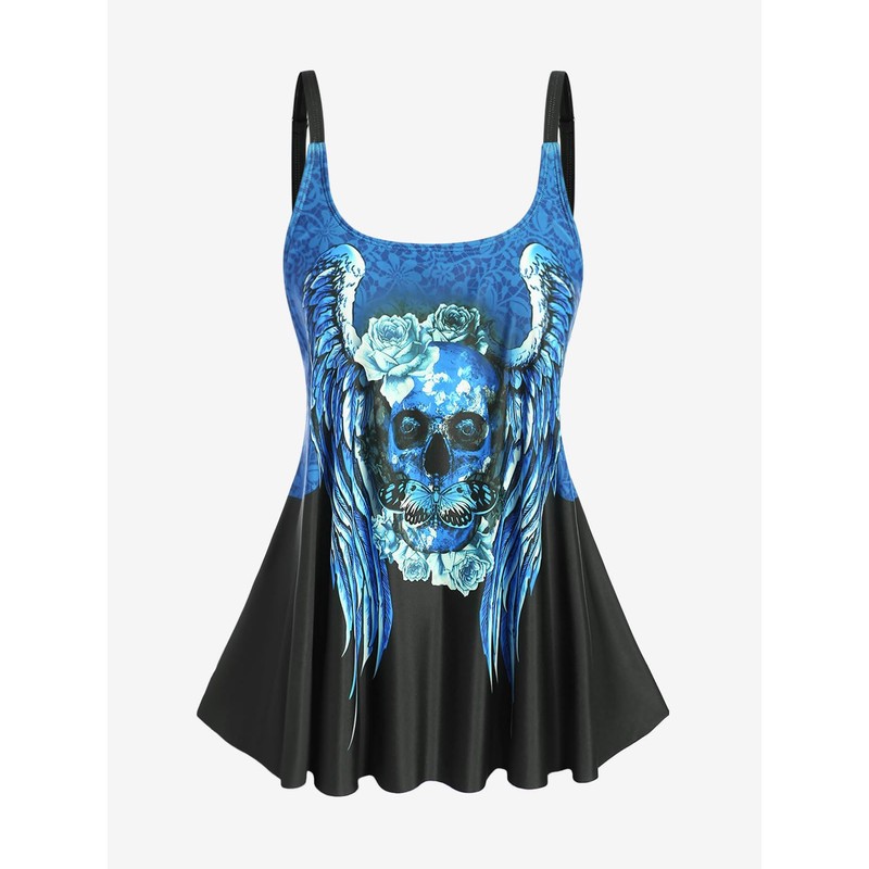 Rosegal Womens Plus Size Skull Rose Wing Print Cinched Boyshorts Tankini Swimsuit Set(Blue_1/3X)